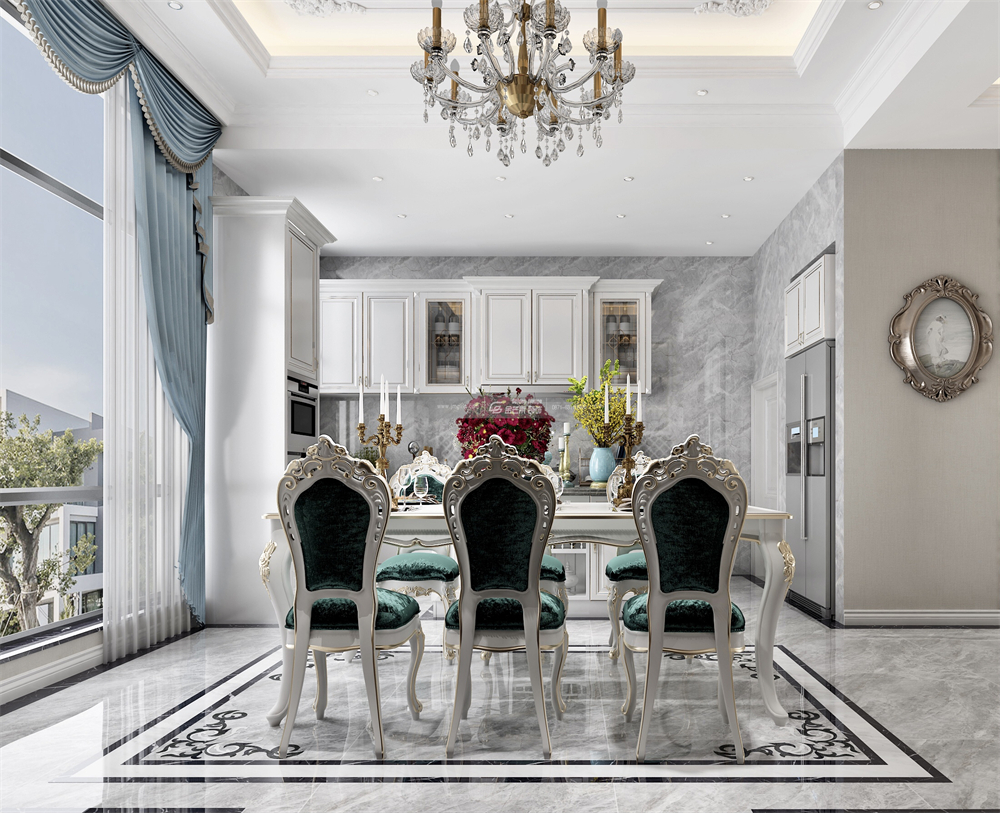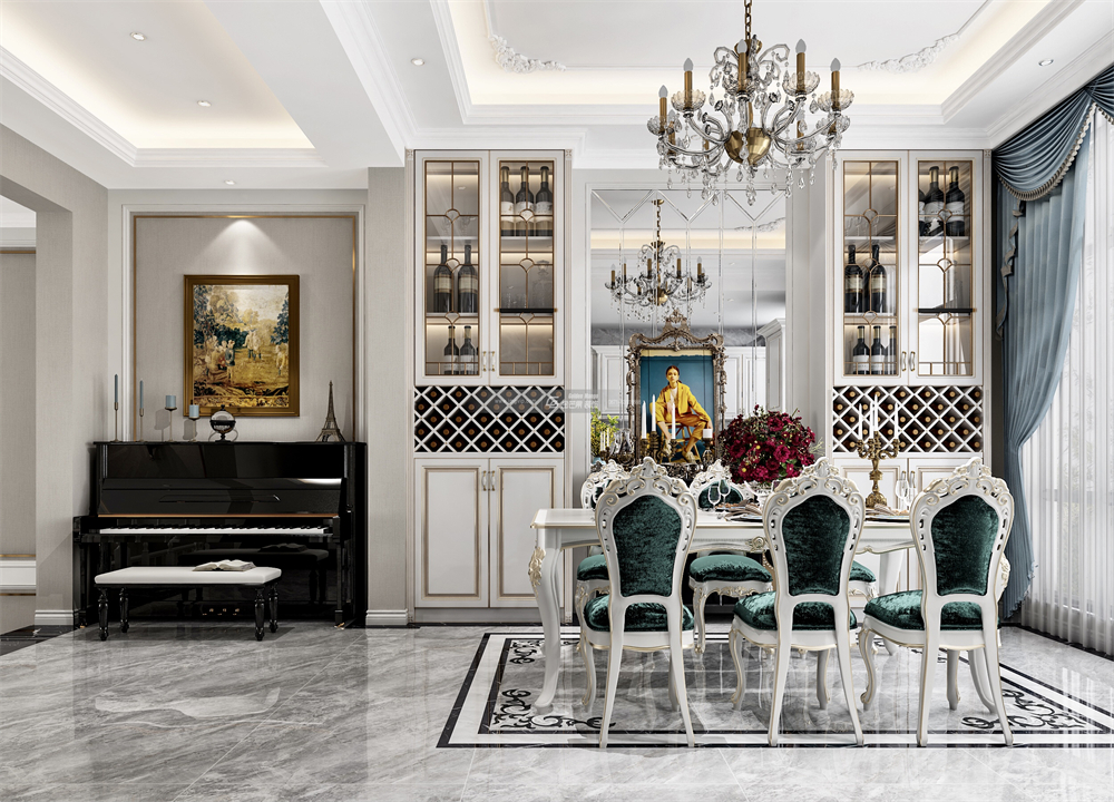 湖藍色的羅馬簾蘊含優(yōu)雅氣質,使空間增添了幾分美感,同時也為空間帶來一股濃濃的藝術氣息。歐式宮廷的餐桌椅復古又經(jīng)典,仿佛穿越到了古代歐洲,在這樣充滿情調的餐廳就餐,每天都是一種享受!