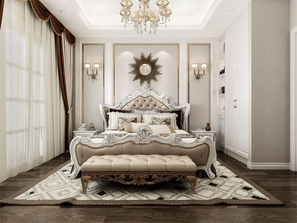 主臥以奶白色為主色調,整個空間極具奢華典雅,傳承著歐式文化底蘊的壁燈與吊燈泛著影影綽綽的燈光,朦朧、浪漫之感不由自主的散發(fā)開來,連空氣中都是溫馨的感覺!