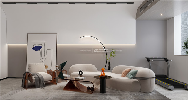 暖白色沙發營造溫暖溫柔的感覺,和灰色搭配得相得益彰。灰色地毯,藝術感又增加了幾分。