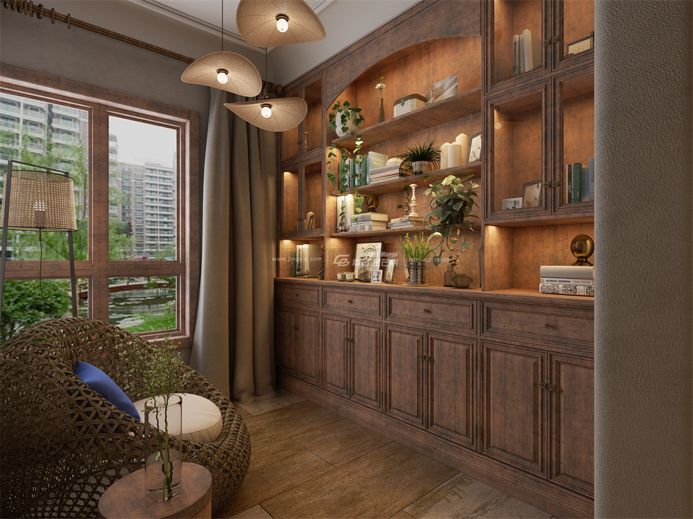 空間細(xì)節(jié)滿滿,不管是吊頂、地板、還是椅子等,都運用了實木、編藤等元素,復(fù)古的紋理、精湛的工藝,打造出這個回歸自然、獨具魅力的愛家!