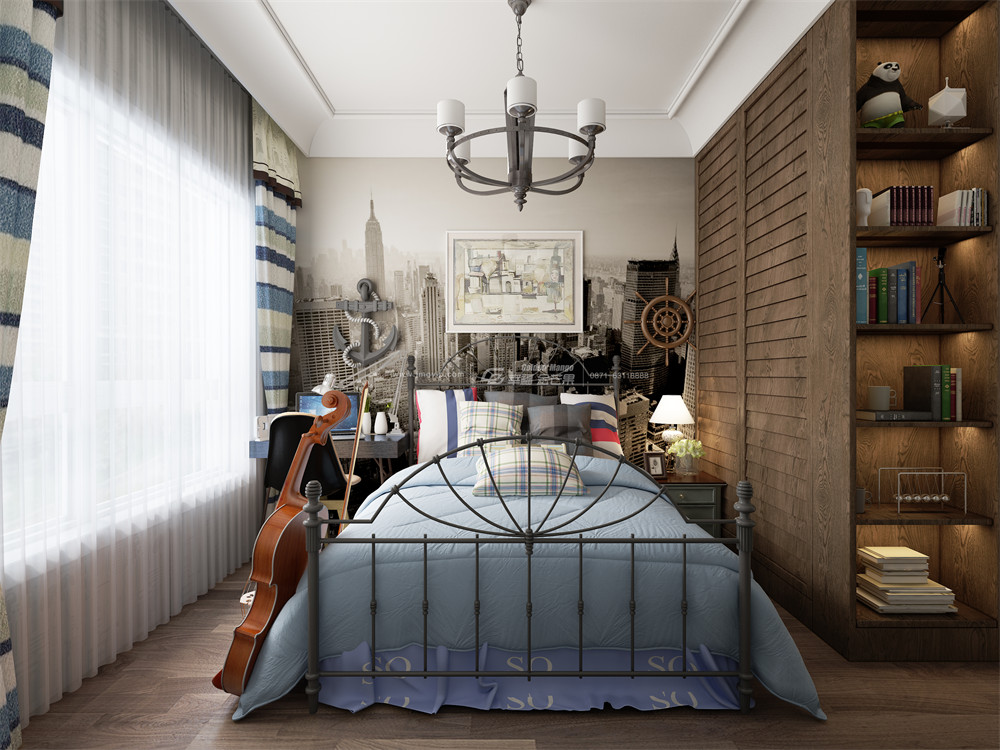 藍灰色的主題令空間更加理性與靜謐,也更符合男孩子的氣質(zhì),原木柜體帶來溫潤之感,而床、吊燈的鐵藝材質(zhì)又為空間增添干練、硬朗之感,二者巧妙融合,令空間更具韻味!