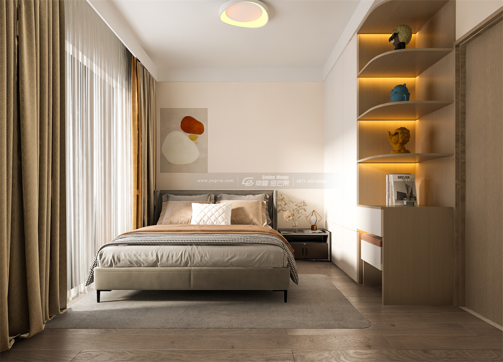 次臥柜體沿著墻面定制,一墻到頂,還設(shè)計(jì)了弧形的開(kāi)放格,放上喜歡的書(shū)籍或擺件,別有一番韻味,靜謐又美好,實(shí)用性也高!