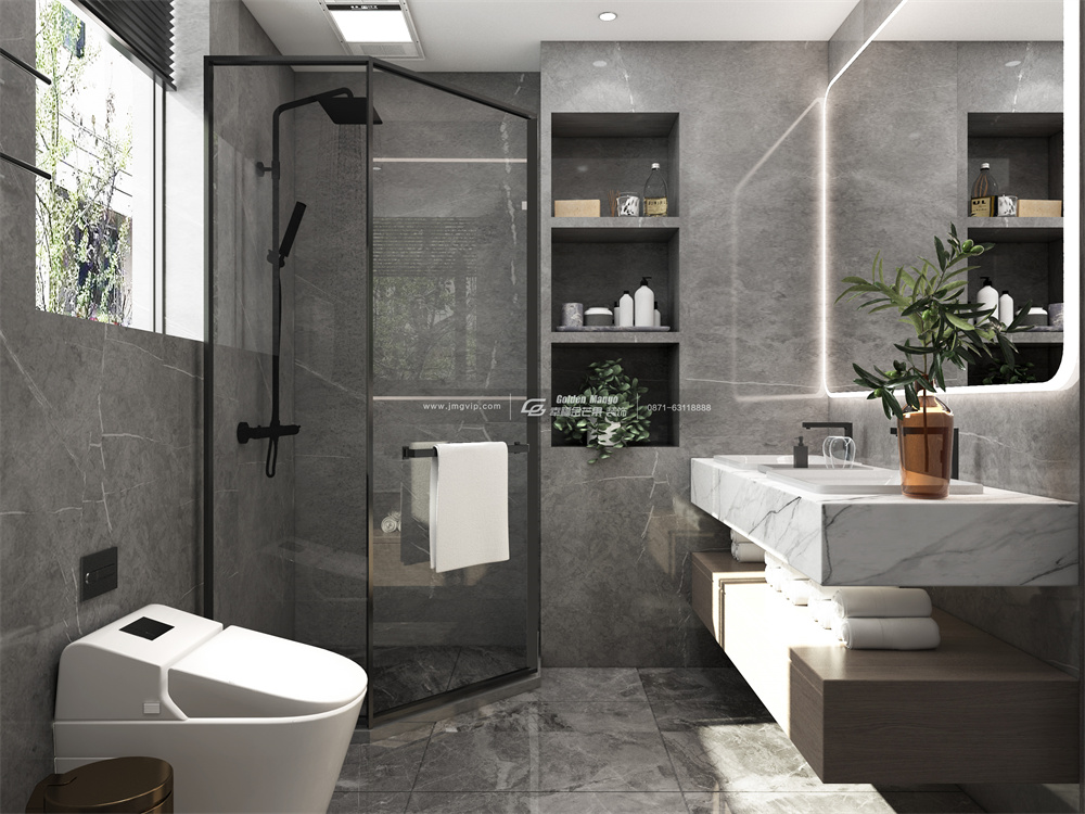 衛(wèi)生間整體用灰色大理石鋪貼,耐臟又耐看;在靠近窗戶的地方設(shè)置淋浴房,以透光性強(qiáng)的玻璃做隔斷,既可以充分利用空間,干濕分離,又可以增加衛(wèi)生間的采光,一舉多得。