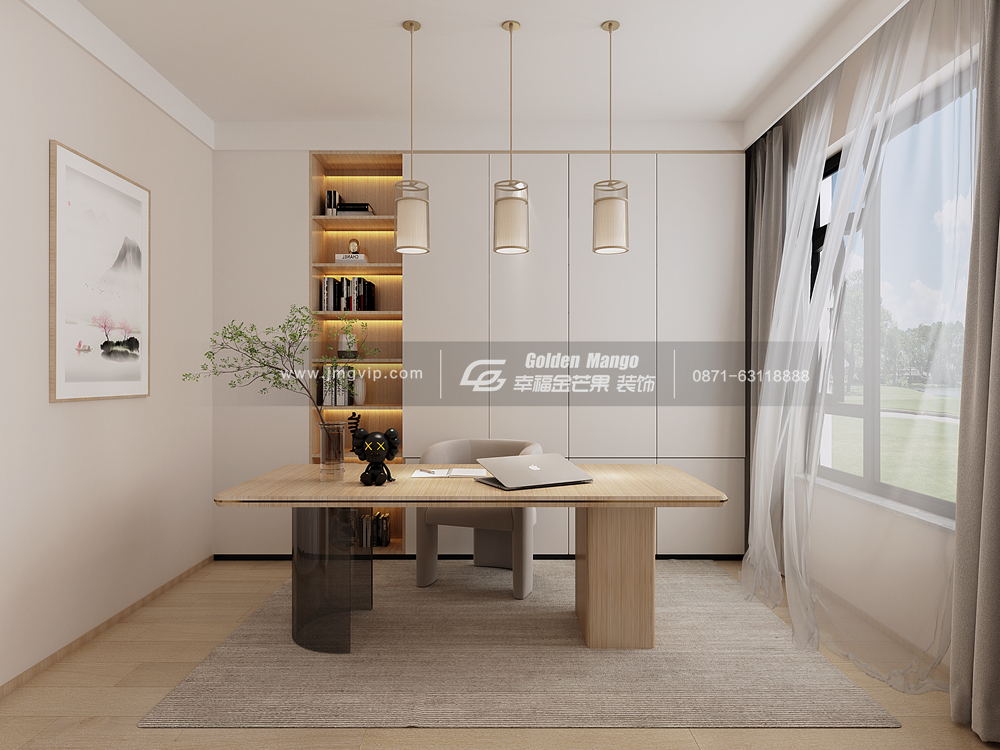 正對(duì)客廳的房間設(shè)置成書(shū)房,工作的沉靜與家居生活的溫馨各成一區(qū),互不干擾;極簡(jiǎn)的書(shū)房不僅工作,喝茶讀書(shū),靜品時(shí)光韻味,浮躁的心情都變得舒緩起來(lái)。