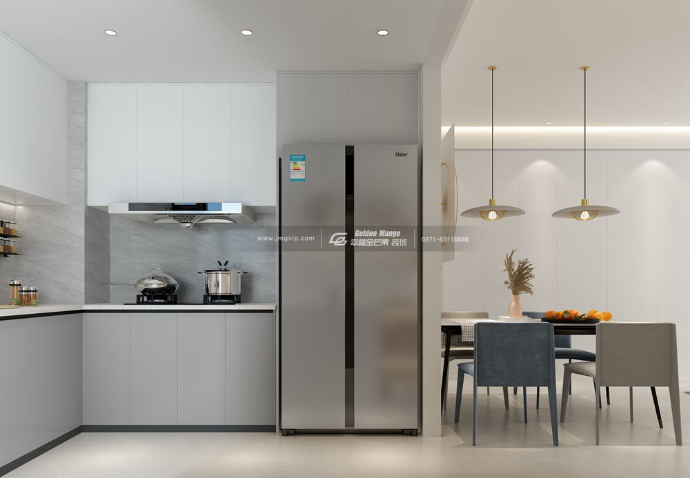 廚房L形設(shè)計布局流暢,方便日常烹飪操作,沿墻面設(shè)置吊柜壁櫥,充分的收納空間使得廚房物品井然有序,看著心情就好了起來;餐廚區(qū)域的半開放設(shè)計好像連接起了兩個世界,一邊忙碌于三餐四季的煙火氣息,一邊脫下疲憊享受家的美味,平淡美好,足慰此生。