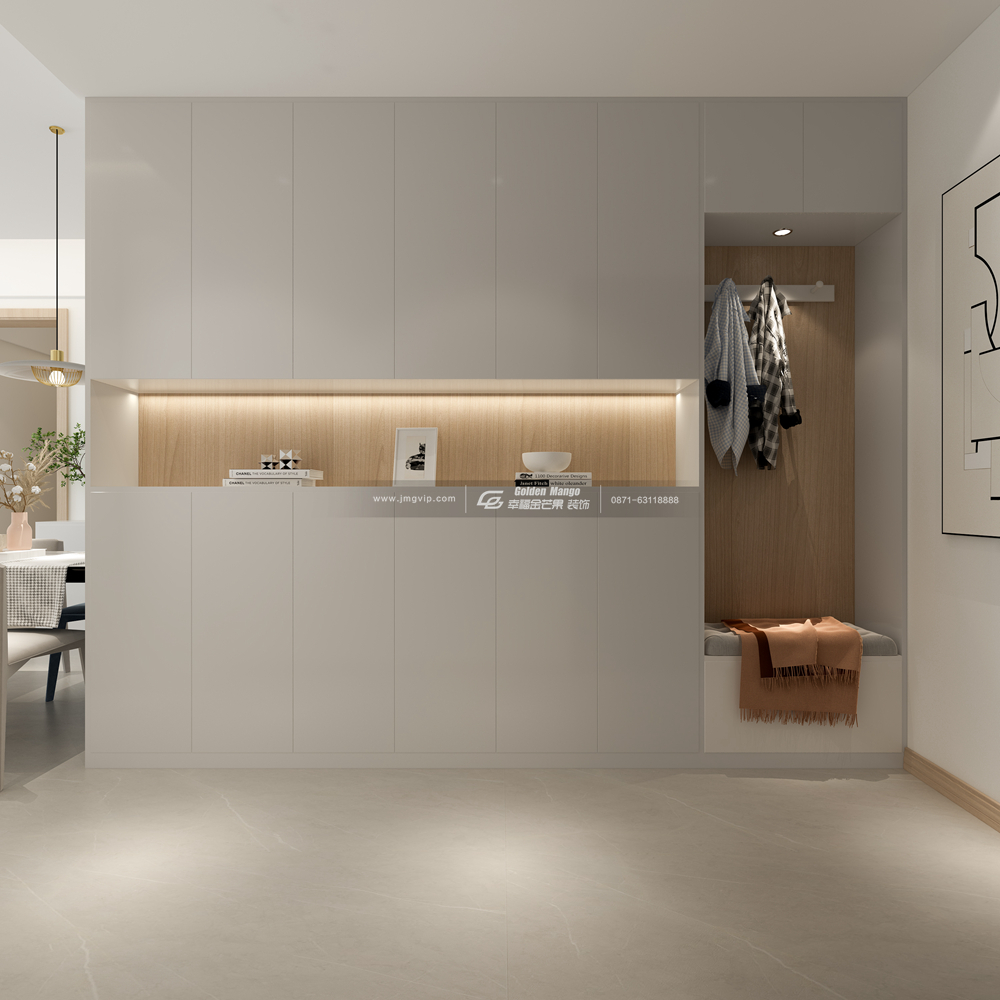 入戶設(shè)計純白色的收納柜體和線條感裝飾畫,簡約大氣;中部鏤空,方便進出門小物件的擺放,簡單的裝飾和收納,滿足居家的實際需要,簡約而靈巧的設(shè)計以精致款待美好生活。