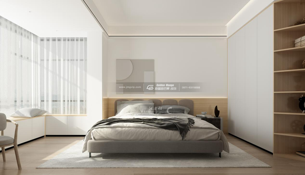 主臥以簡白色調(diào)搭配原木色地板,淡雅而清新,整個空間充滿舒適感;原木色的床頭柜和衣柜內(nèi)里置物架的設(shè)計為簡白的空間增加了質(zhì)感與層次,極簡中又顯現(xiàn)出對生活品質(zhì)的追求。