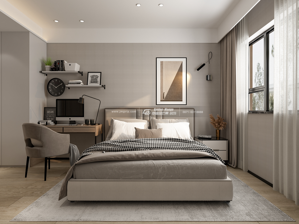 次臥降低了主臥的色調感,整體采用淺棕色和淡灰色營造空間舒適淡樸的氛圍,更加有助于睡眠和緩解疲勞;放棄傳統吸頂吊燈設計采用無主燈設計,以小射燈、燈帶和壁燈營造溫馨舒適的感覺,整個空間設計更顯精致氛圍。