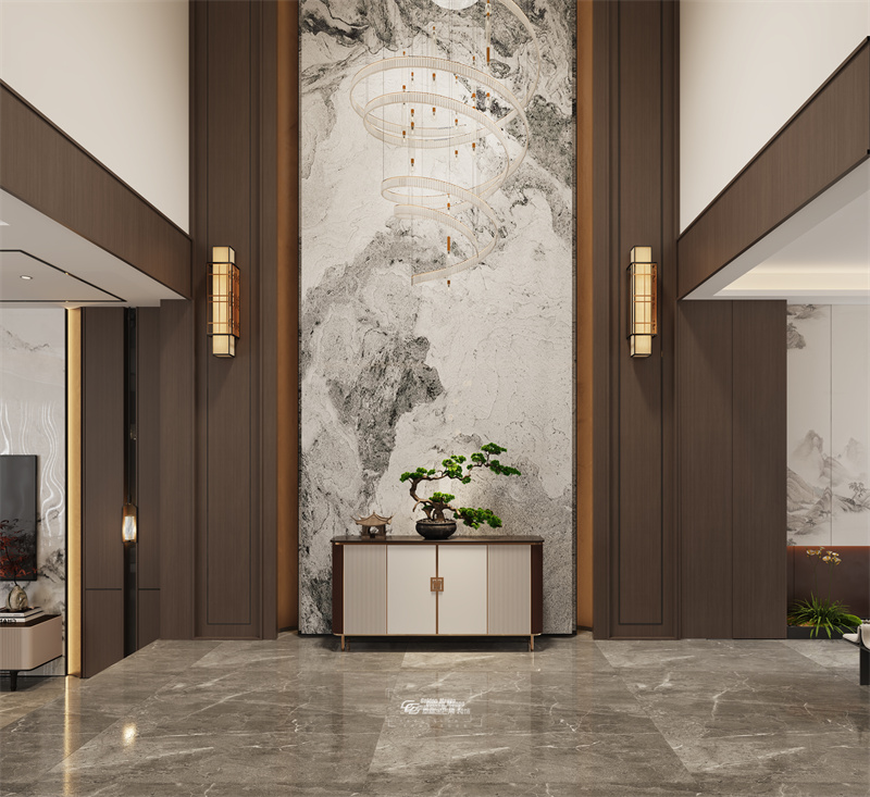 背景墻是大幅的水墨山水傾瀉而下,挑空的設計更顯別墅空間的氣勢恢宏,同時也彰顯出屋主高瞻遠矚的生活態度。一進入空間,一番自由大氣的遼闊景象躍然于眼前,提升居住舒適感。