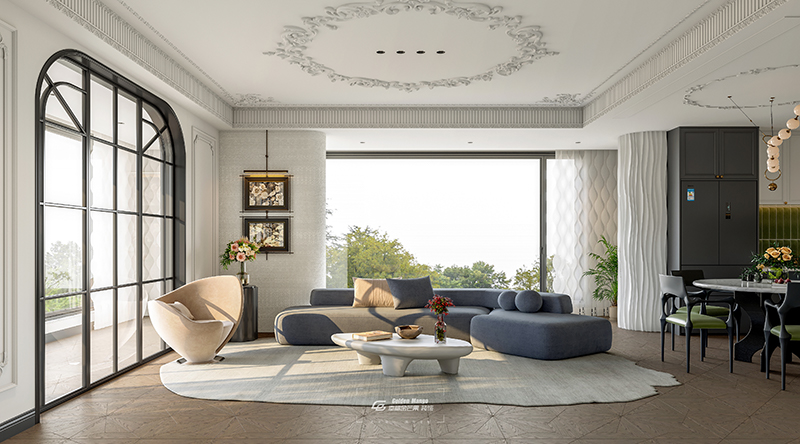 踏入客廳,開闊空間映入眼簾。大型拱形落地窗如畫框般,將室外自然風光攬入懷中,陽光灑落,光影交錯間,盡顯美式風格的優雅與大氣。淺色系的沙發組合線條流暢,圍合出溫馨的交流場域,搭配上不規則的茶幾與柔軟地毯,舒適感與格調兼具。