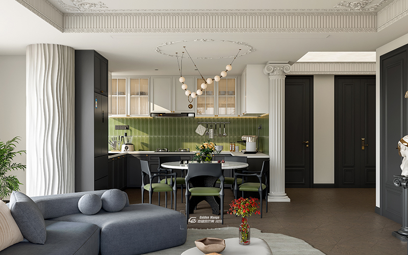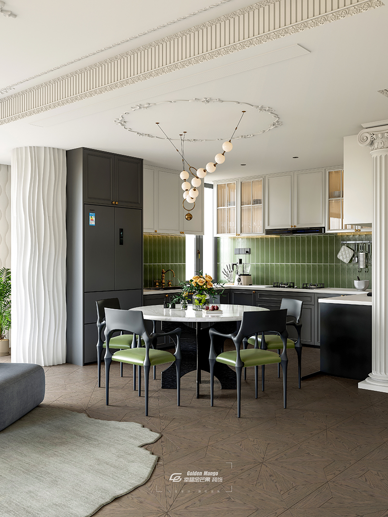 與客廳相連的餐廳區域,同樣別具風味。圓形餐桌置于空間中央,搭配上黃綠色坐墊的餐椅,與廚房區域的綠色墻面相呼應,在色彩上達成巧妙的統一。餐桌上方,吊燈如璀璨星辰,灑下柔和光芒,營造出浪漫的用餐氛圍。