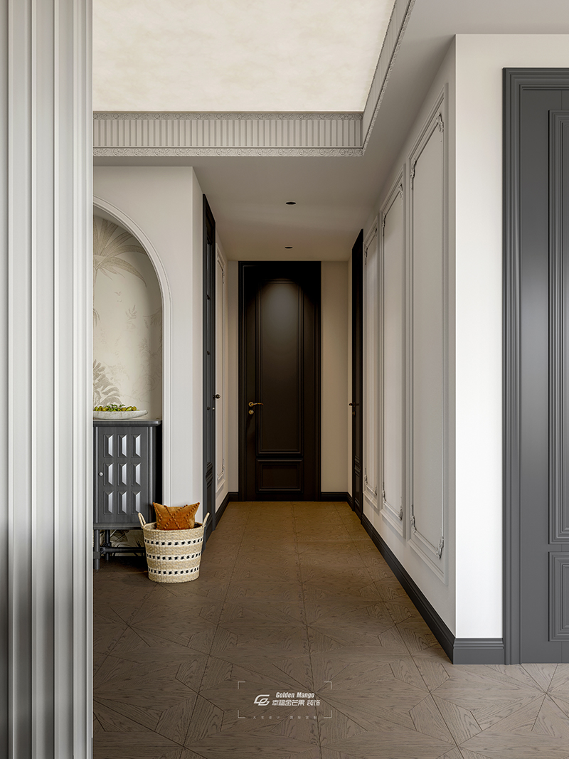 每到用餐時分,家人圍坐,美食飄香,溫馨的氛圍在空間中蔓延,讓日常的每一餐都成為生活的儀式。走廊:藝術的悠長回響走廊雖為過渡空間,卻被賦予了獨特的生命力。墻面的裝飾畫與線條造型,猶如跳動的音符,為歸家之路增添藝術韻律。地面紋理與整體風格呼應,漫步其中,仿佛穿梭在藝術長廊,讓每一次歸家都充滿期待。