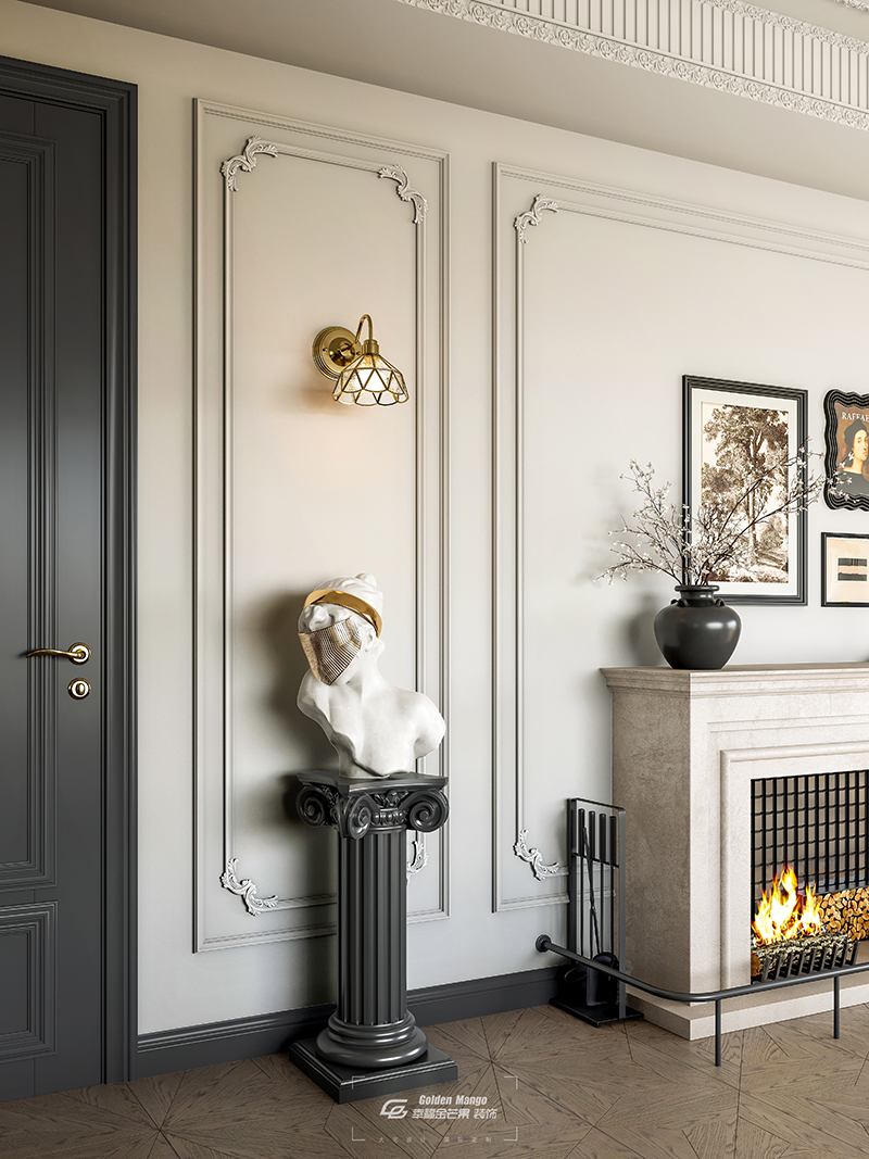 墻面有精致護墻板與裝飾壁燈,搭配雕塑、壁爐及裝飾畫,整體風格偏藝術、典雅,營造出富有格調的氛圍,用于日常休憩、交流,展現屋主對生活美學的追求,是家中兼具美觀與功能的公共活動區域。