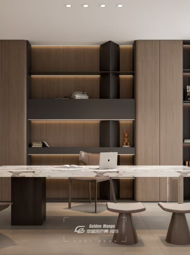 木質(zhì)書架與巖板書桌對(duì)話,利落線條里,藏著專注的力量。開闊空間不設(shè)拘束,可伏案深耕,亦可隨性閱讀。嵌入式燈帶柔和灑落,為書頁鍍上暖光,陽光透過百葉簾,在地面跳成光斑。把喧囂隔絕在外,獨(dú)享這方沉浸式靜謐,讓思緒在簡(jiǎn)雅氛圍里,沉淀出生活的哲思。