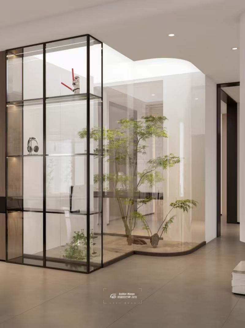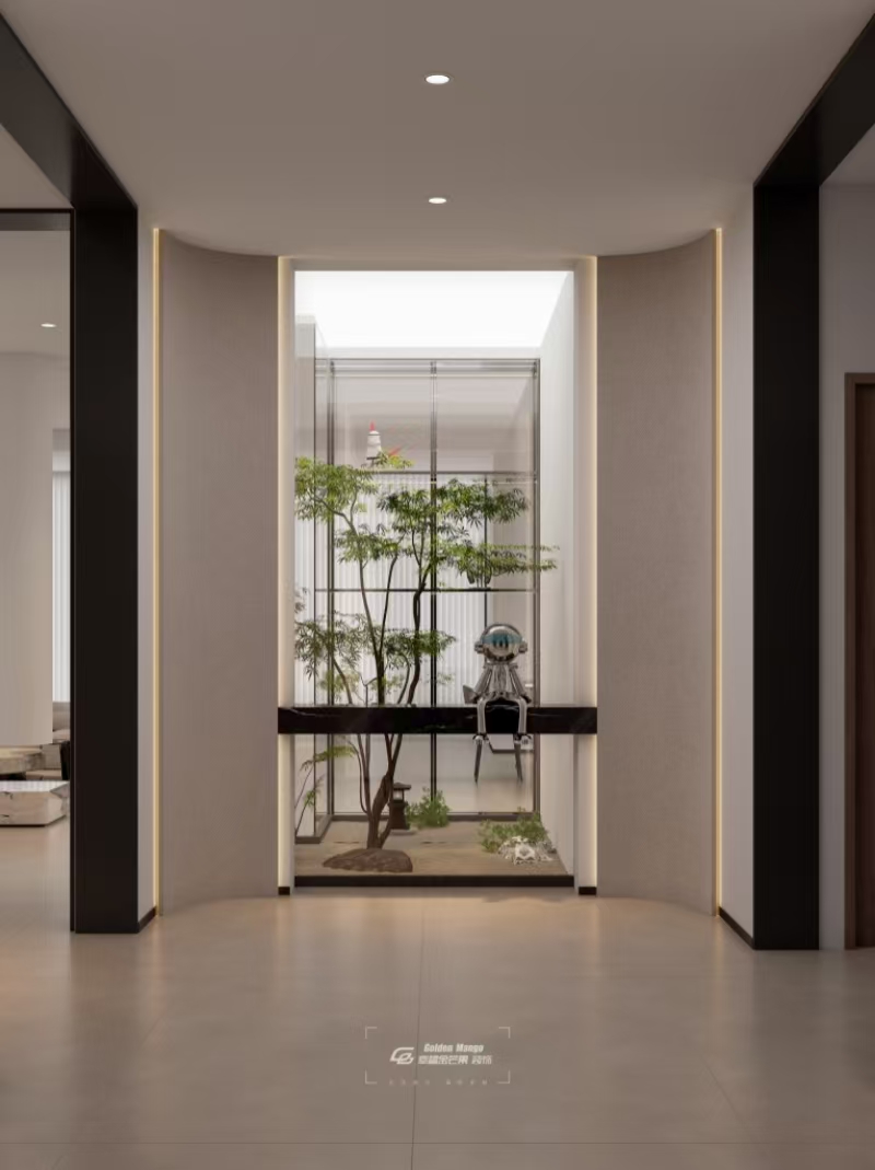 弧形墻體柔化空間棱角,玻璃隔斷框住微型景觀,松石、綠植與藝術(shù)擺件共生。踏入玄關(guān),仿佛走進(jìn)自然與藝術(shù)編織的詩意小徑,卸下疲憊,讓家的溫柔,從第一步就緊緊包裹身心,把門外的紛擾,都留在這方小天地之外。