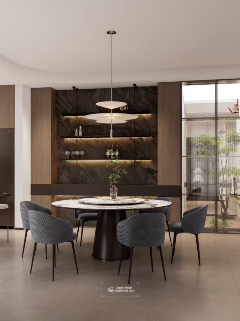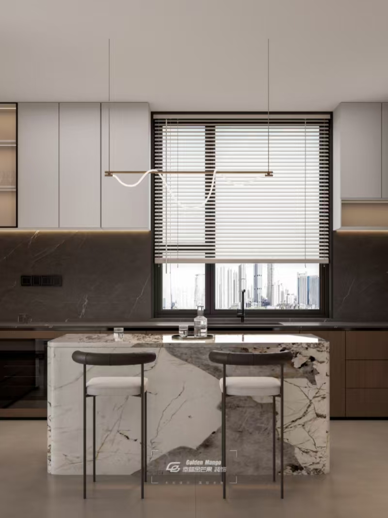淺灰櫥柜與深灰?guī)r板碰撞,勾勒出利落的幾何線條,中島臺(tái)的大理石紋理似一幅流動(dòng)的山水長(zhǎng)卷。垂墜的藝術(shù)吊燈,為備餐時(shí)光暈染溫馨光暈。百葉窗輕掩,將城市天際線框成窗景,在這里,烹飪不再只是家務(wù),而是與家人分享煙火、品味生活的浪漫儀式,每一次舉杯,都藏著對(duì)平凡日常的熱愛。