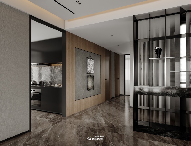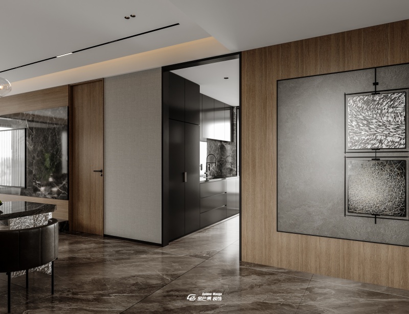淺灰、木色、深灰為主色調,地面通鋪大理石紋理地磚,延伸空間感,上方線性燈光與球形吊燈呼應,展現出意式極簡 “少即是多” 的美學,讓空間既顯開闊又充滿細節。