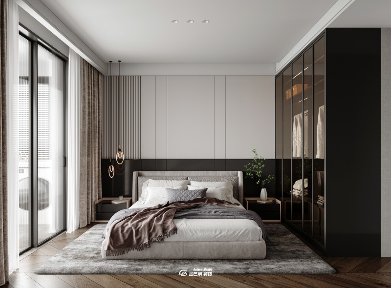 材質選質樸木色地板、柔軟地毯,搭配通透玻璃移門,引自然光入室。定制玻璃衣柜,實用又具展示性,綠植點綴添生機,整體簡約舒適,盡顯意式 “少而精” 的美學。