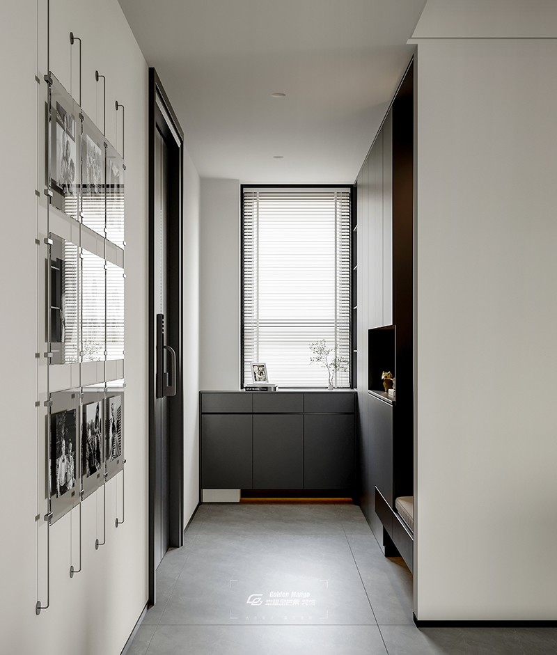 另一側的黑色柜體和照片墻形成強烈對比,簡約又大氣。地面的淺灰色地磚一路鋪開,從玄關延伸到室內,視覺上直接把空間拉大了好幾倍,看著就敞亮。