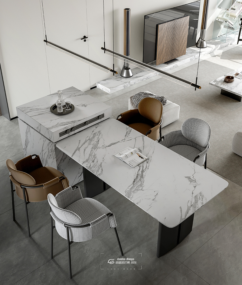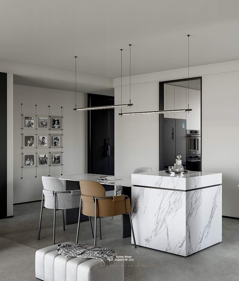 再看看餐廳,白色大理石餐桌居中而放,紋理優雅得不像話,搭配的餐椅也很有特點,既有編織紋理的現代感餐椅,又有棕色皮革餐椅,坐感超棒,而且顏值也在線。