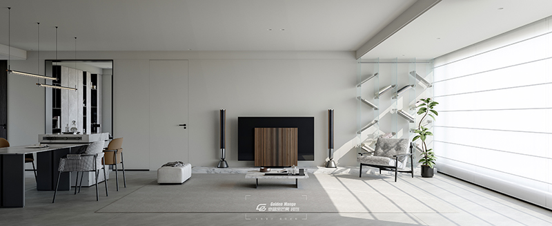 電視墻設計也很有心思,電視嵌在墻里,兩邊是木質格柵,簡約中帶著點自然的溫馨。兩側的黑色柱狀音響,看起來就很高級,放起音樂來,整個客廳都像在開小型音樂會。