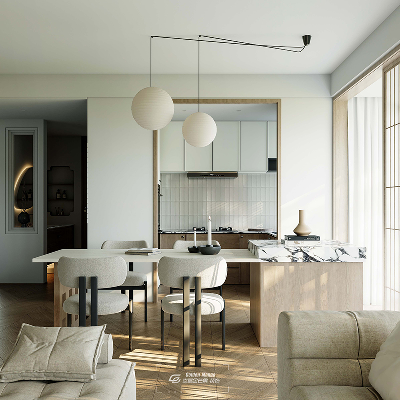 餐廳與廚房以開放之姿相連,模糊了界限,讓生活在這里流轉(zhuǎn)得更加自然。白色的餐桌搭配淺色座椅,簡約而不失格調(diào)。桌上的燭臺與綠植,在光影的映襯下,營造出浪漫而溫馨的用餐氛圍。