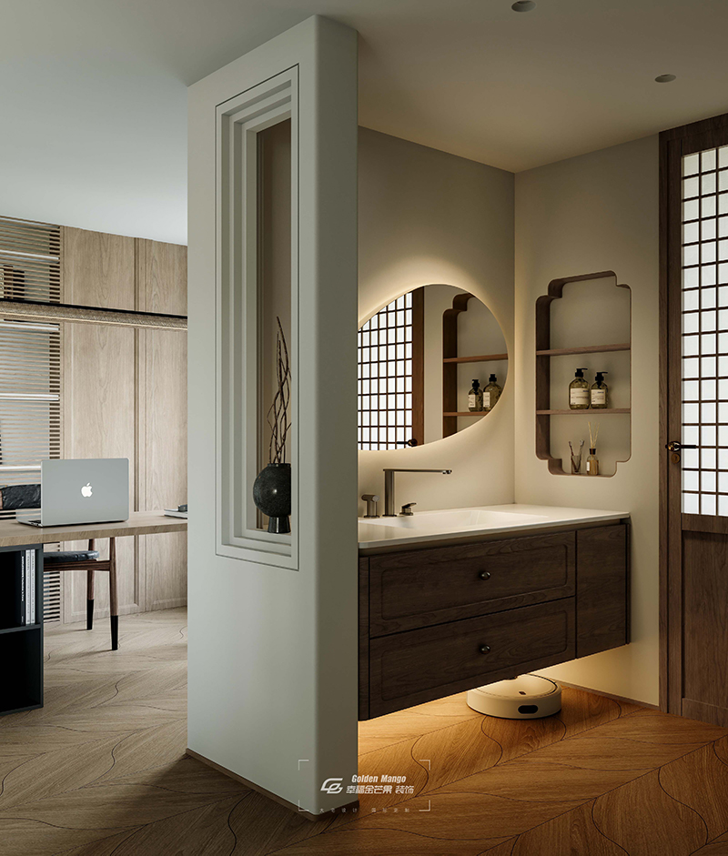 洗漱臺的設(shè)計(jì),是這片空間里的精致注腳。中古風(fēng)的木質(zhì)收納柜,搭配現(xiàn)代簡約的洗漱臺,傳統(tǒng)與現(xiàn)代在這里和諧共生。