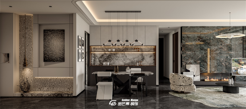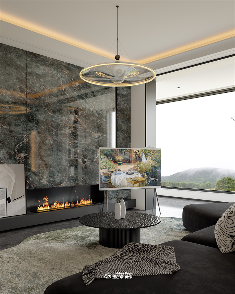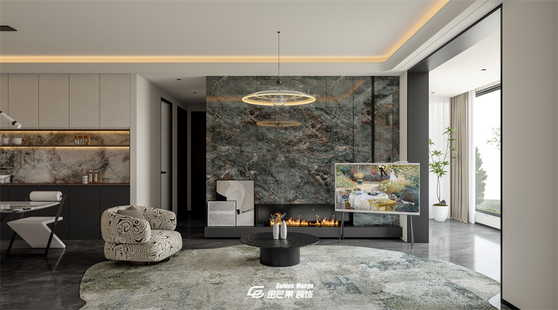 采用紋理獨(dú)特的深色大理石,自帶高級(jí)質(zhì)感,下方的壁爐設(shè)計(jì),火焰跳動(dòng)增添了溫馨與氛圍感。