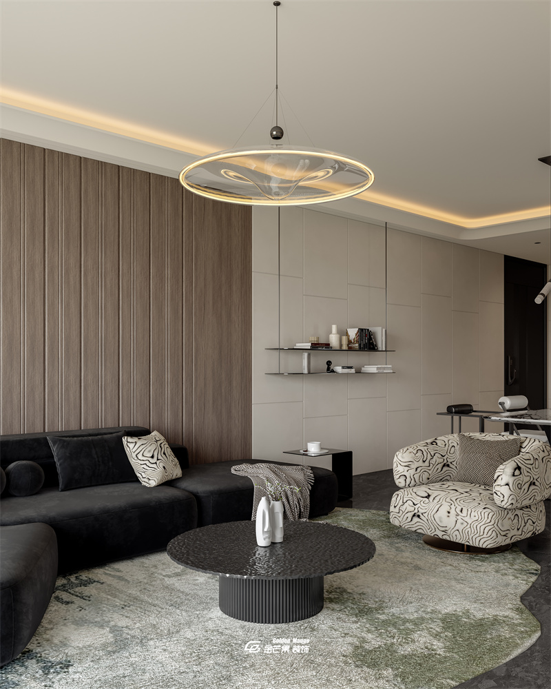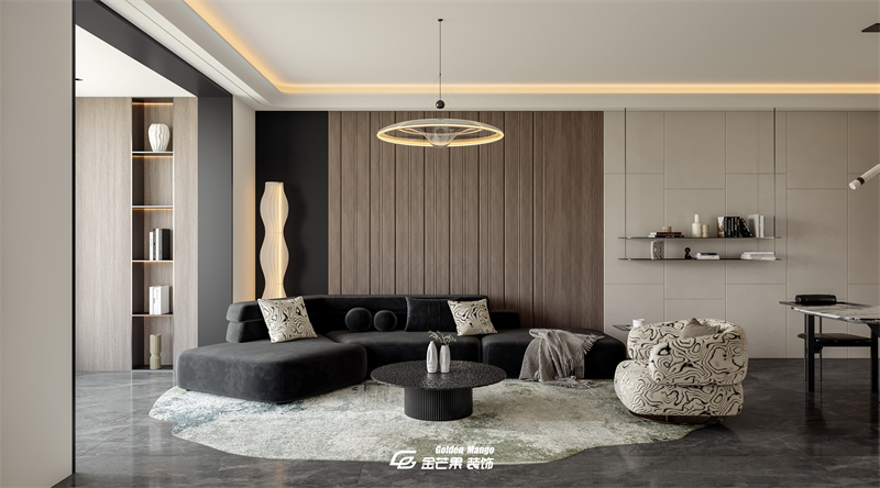黑色的大尺寸沙發(fā)搭配帶有花紋的抱枕,時(shí)尚且舒適;旁邊造型獨(dú)特的單人椅,為空間增添了藝術(shù)感。背景墻采用木飾面與黑色板材拼接,層次豐富。上方懸掛的環(huán)形吊燈,造型別致,燈光柔和,提升了空間的溫馨感。