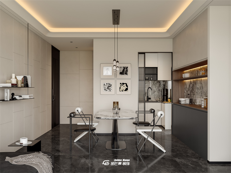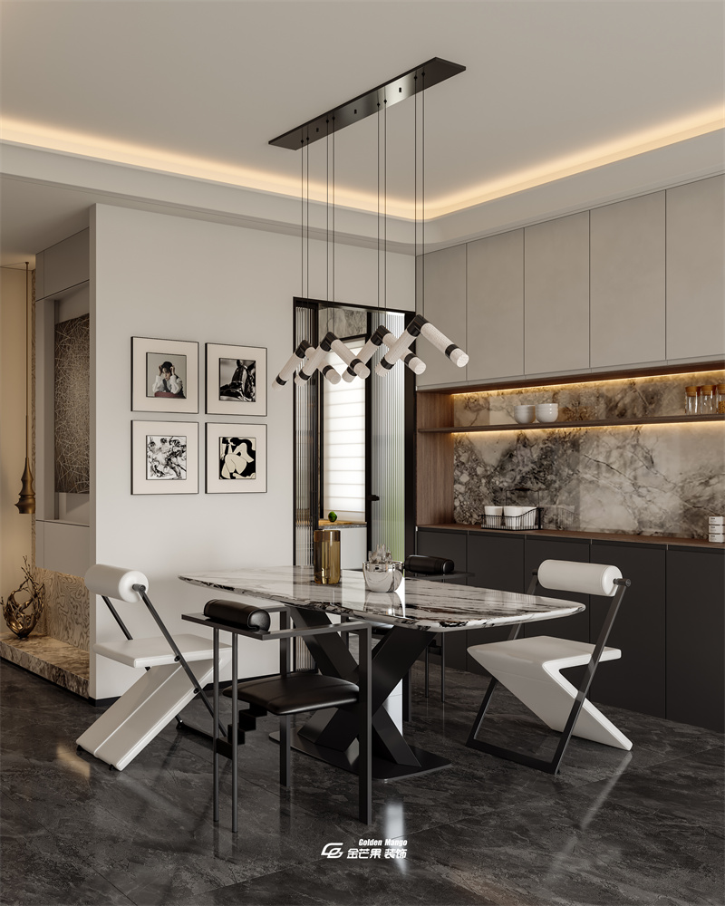 餐桌選用大理石紋理的桌面,搭配黑色的 “X” 形支架,時(shí)尚又穩(wěn)固。周圍的椅子設(shè)計(jì)獨(dú)特,黑白配色簡潔利落,造型別致,為空間增添了藝術(shù)感。