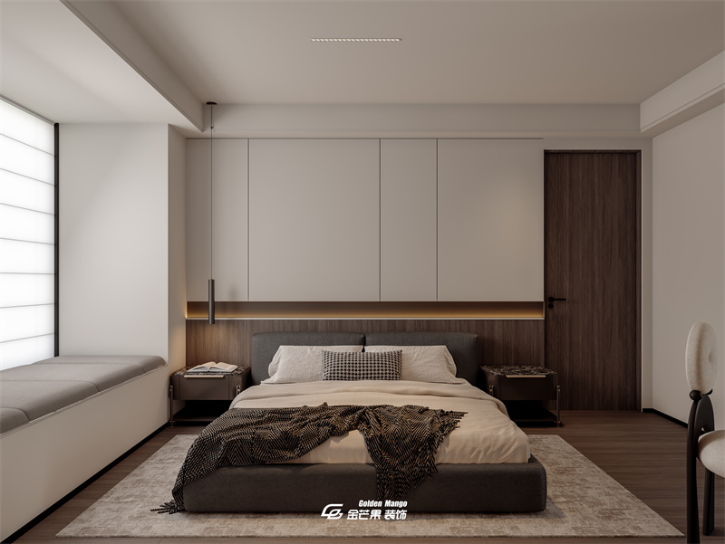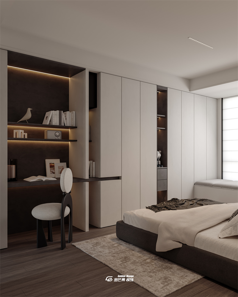主臥衣柜采用了一體化的設(shè)計(jì),以淺色調(diào)為主,與整體空間的現(xiàn)代簡約風(fēng)格相契合。衣柜為嵌入式,很好地利用了墻面空間,顯得簡潔利落。