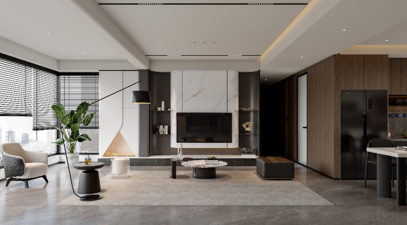 淺灰大理石地磚配同色系地毯,延伸空間感。右側(cè)木飾面與深色家電銜接餐廳,整體通過材質(zhì)拼接、色彩協(xié)調(diào),打造出精致舒適、契合當(dāng)下審美趨勢(shì)的居住空間 。