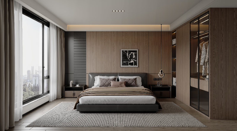 移步至臥室,宛如踏入了專屬的靜謐私域。木飾面的床頭背景墻,結(jié)合柔和的燈光設(shè)計(jì),帶來自然與溫馨的雙重體驗(yàn)。