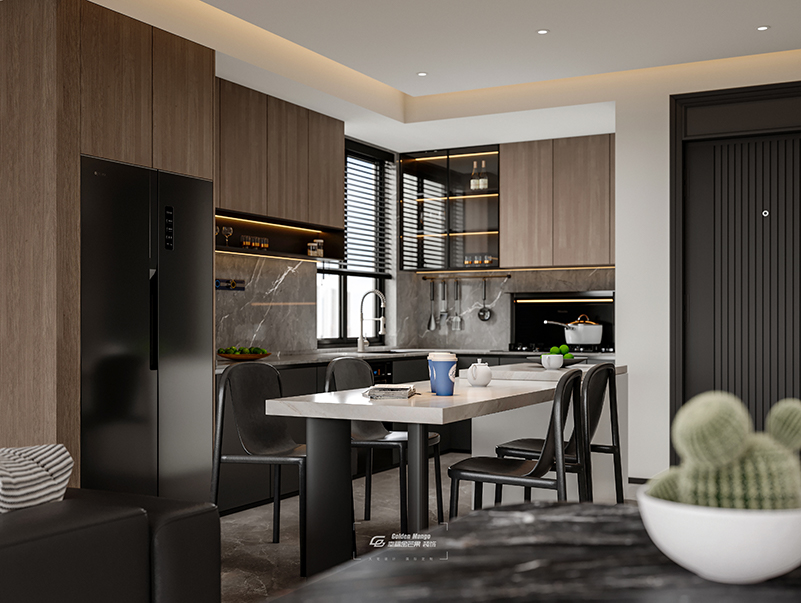 餐廚一體的空間設(shè)計,打破傳統(tǒng)界限,讓烹飪與用餐不再只是單一的生理需求,而成為一種充滿煙火氣的生活享受。現(xiàn)代簡約風(fēng)格的餐桌椅,線條流暢,質(zhì)感十足。四把胡桃木餐椅環(huán)繞著大理石臺面餐桌,低調(diào)中透露著奢華。清晨,陽光透過廚房的窗戶灑在餐桌上,為一頓豐盛的早餐增添了幾分溫暖與活力。