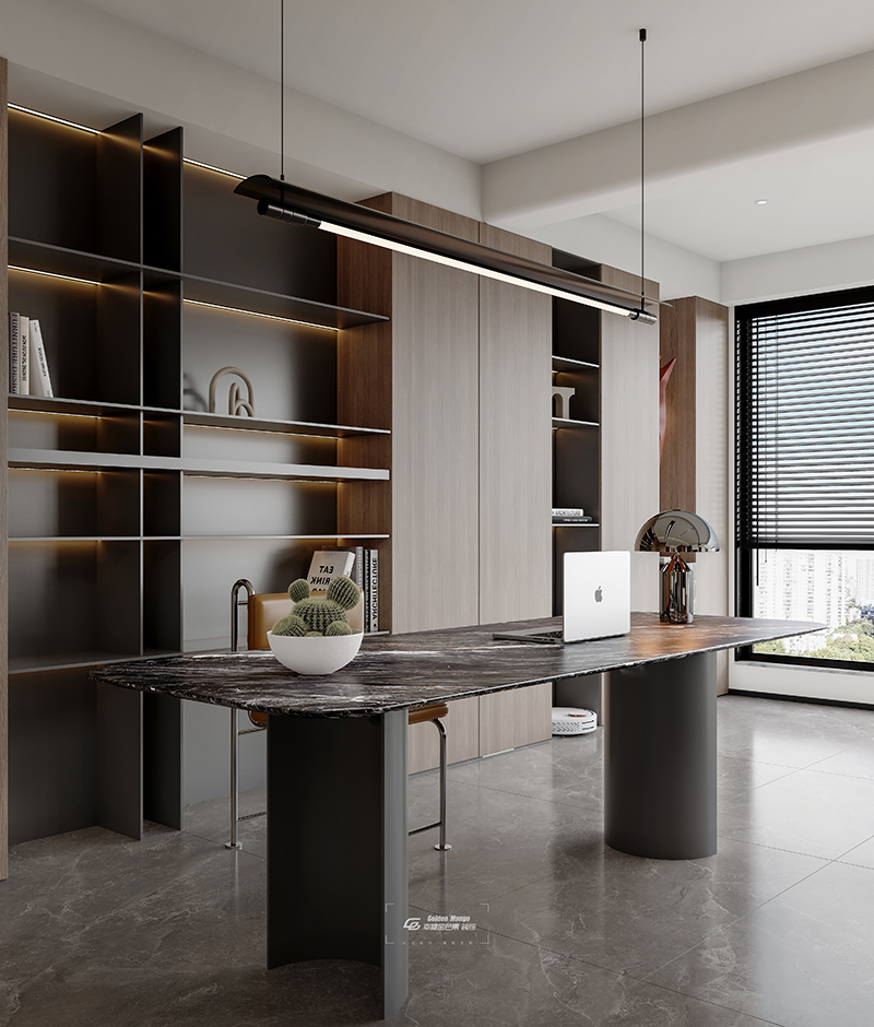 穿過客廳,便是書房,這個靜謐的空間里藏著主人追尋夢想的足跡。大幅落地窗,讓自然光毫無保留地傾灑進來,白日里,你可以伴著陽光閱讀、寫作、思考。夜晚降臨,打開書房內(nèi)隱藏的燈帶,柔和的光暈籠罩整個空間,營造出專注而寧靜的氛圍。木質(zhì)書架、玻璃隔斷、開放式置物架,設(shè)計多樣,卻和諧統(tǒng)一。書籍、擺件、綠植,錯落有致地擺放其中,每一處細節(jié)都彰顯出主人的品味與格調(diào)。