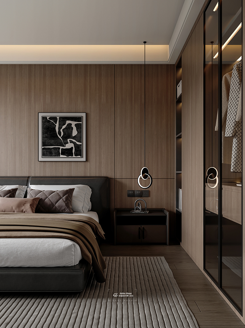 主臥,宛如一個溫暖的懷抱,靜靜等候著疲憊的你歸來。大面寬的窗戶,將窗外的景色毫無保留地引入室內(nèi),無論是清晨的第一縷陽光,還是夜晚的點點繁星,都成為臥室里不可或缺的風(fēng)景。床頭背景墻采用木質(zhì)板飾面,搭配線條燈帶,營造出自然且富有層次感的氛圍。床頭兩側(cè)的圓形吊燈,線條簡潔,卻又散發(fā)著柔和的光芒,為臥室增添了幾分溫馨與浪漫。