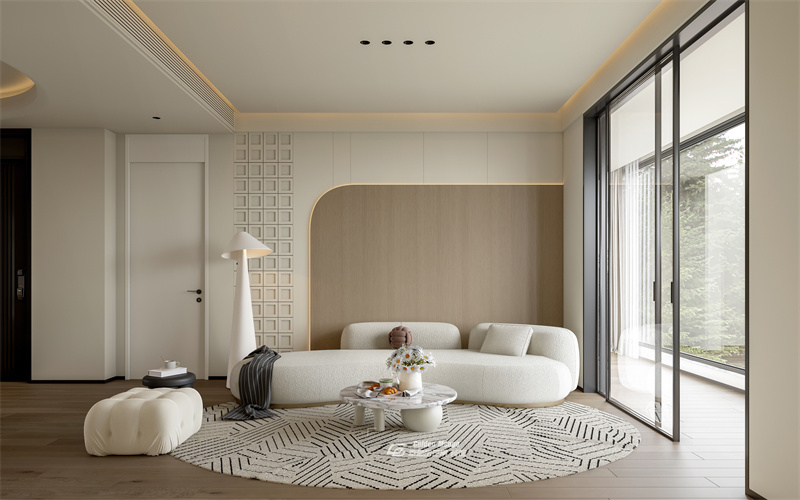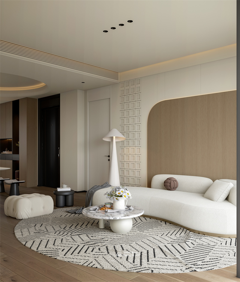 空間以 “淺色系 + 木質(zhì)肌理” 為基底,弱化了現(xiàn)代風(fēng)格的冷硬,多了份松弛親和:造型圓潤(rùn)的白色沙發(fā)像一朵 “云”,慵懶地承接生活的閑逸;黑白紋理的圓形地毯如藝術(shù)畫(huà)布,為空間錨定 “隨性又精致” 的基調(diào)。