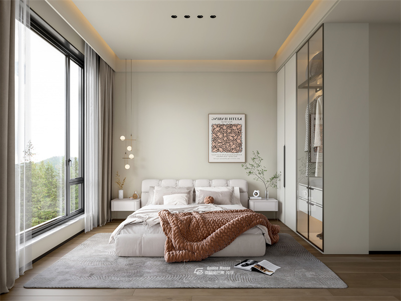 臥室延續(xù)了整體的柔和調(diào)性,大面積窗戶(hù)引入滿(mǎn)室自然光,讓空間清朗如晨。淺米色墻面、軟乎乎的床品,再綴以焦糖色毛毯,溫馨與層次兼具;定制玻璃衣柜通透又整潔,衣物收納一目了然,還為空間添了幾分現(xiàn)代感。