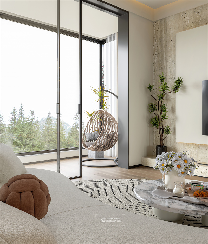 推開(kāi)門(mén),客廳的通透感瞬間攫住視線(xiàn):超大全景推拉門(mén)如 “取景框”,將窗外綠意溫柔納入室內(nèi),晴日里,陽(yáng)光漫過(guò)地板,連空氣都泛著暖調(diào)。
