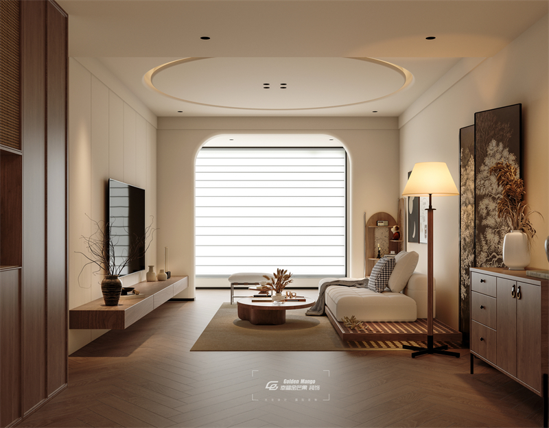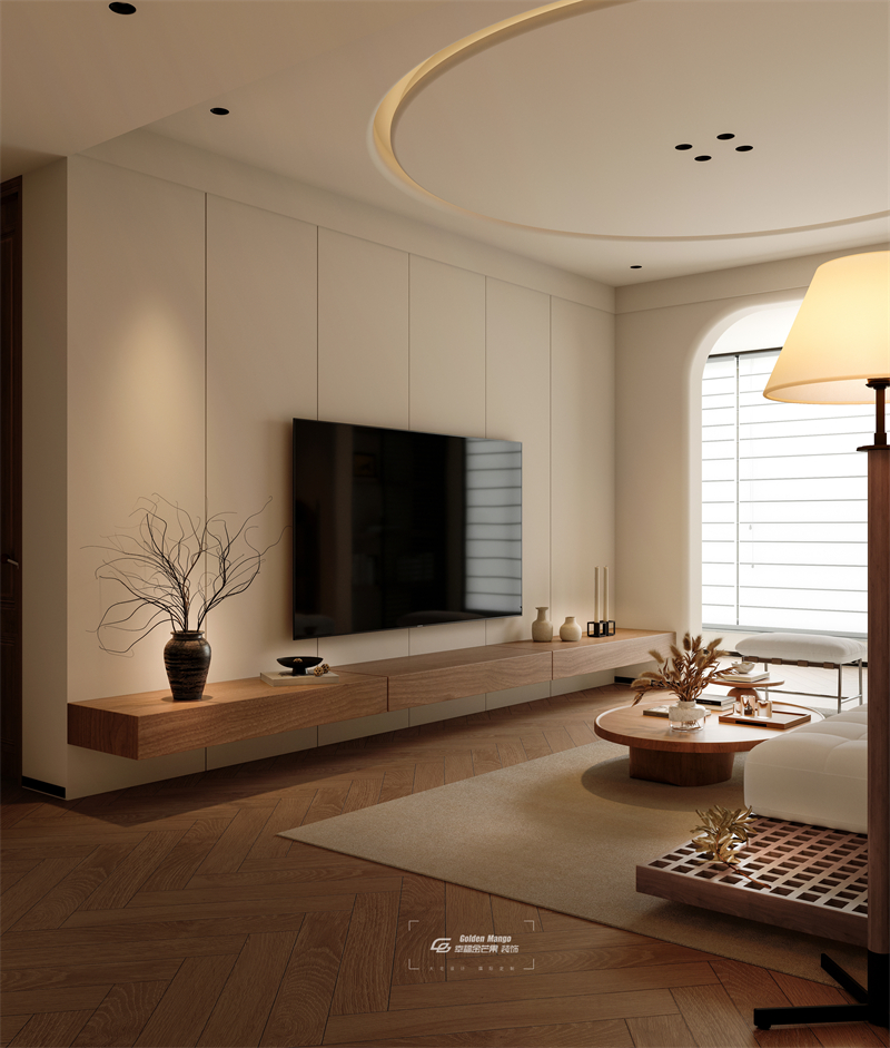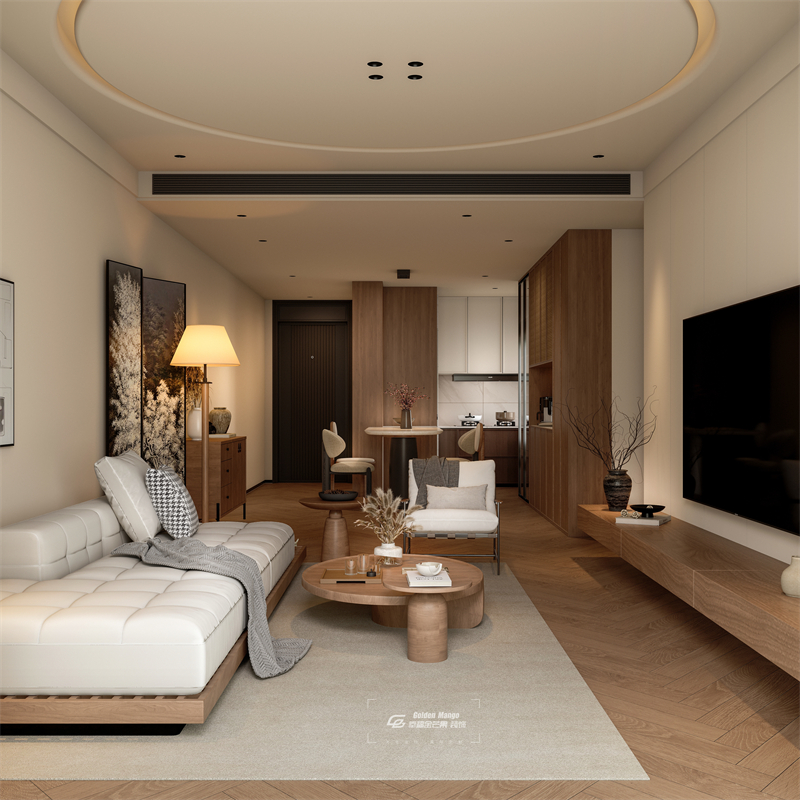 空間以淺色調為主,搭配木質元素,營造出溫馨自然的氛圍。家具造型簡潔,線條流暢,如圓潤的茶幾、簡約的沙發,盡顯舒適與時尚。
