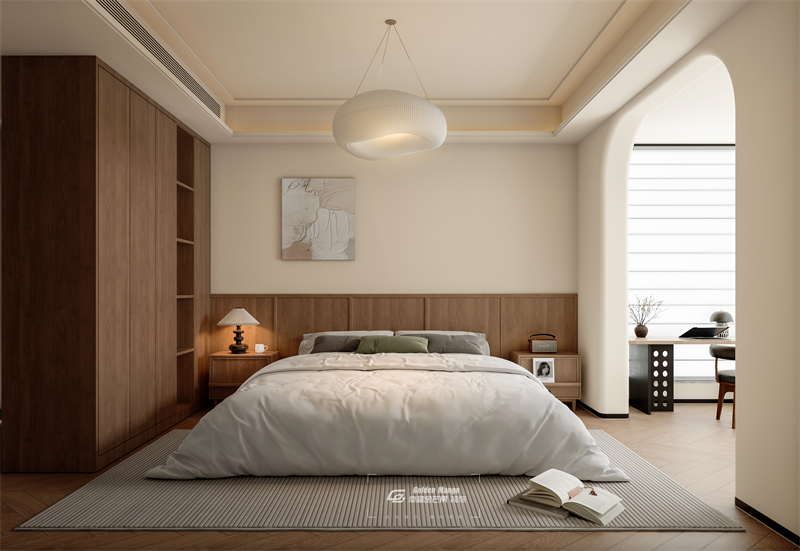 床頭背景墻采用了木質板材,與兩側的床頭柜以及左側的大衣柜相呼應,整體感很強。床頭柜上擺放著臺燈、小擺件等,為空間增添了一些生活氣息。