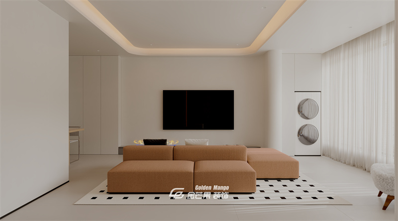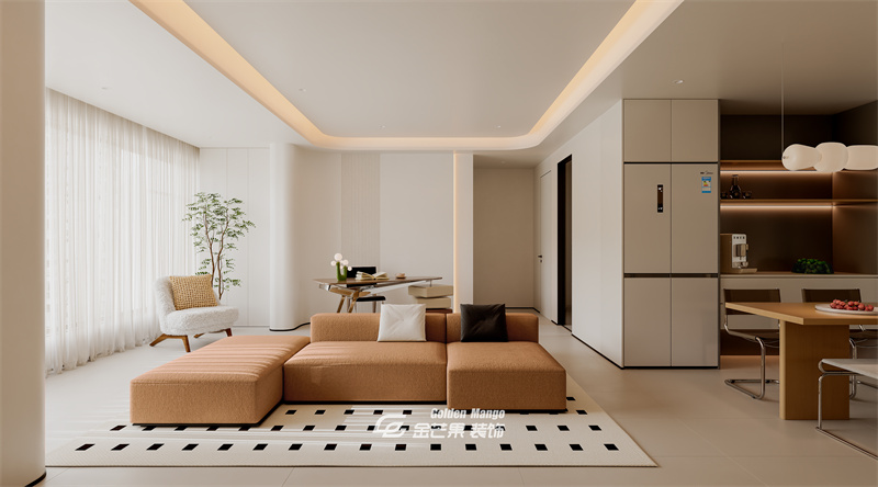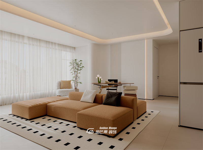 以米白、淺棕等暖色調(diào)中性色為基底,奠定溫馨柔和的空間基調(diào);搭配黑白幾何圖案的地毯作為點(diǎn)綴,在簡約中增添了一絲設(shè)計(jì)感,整體色彩層次簡潔且協(xié)調(diào)。
