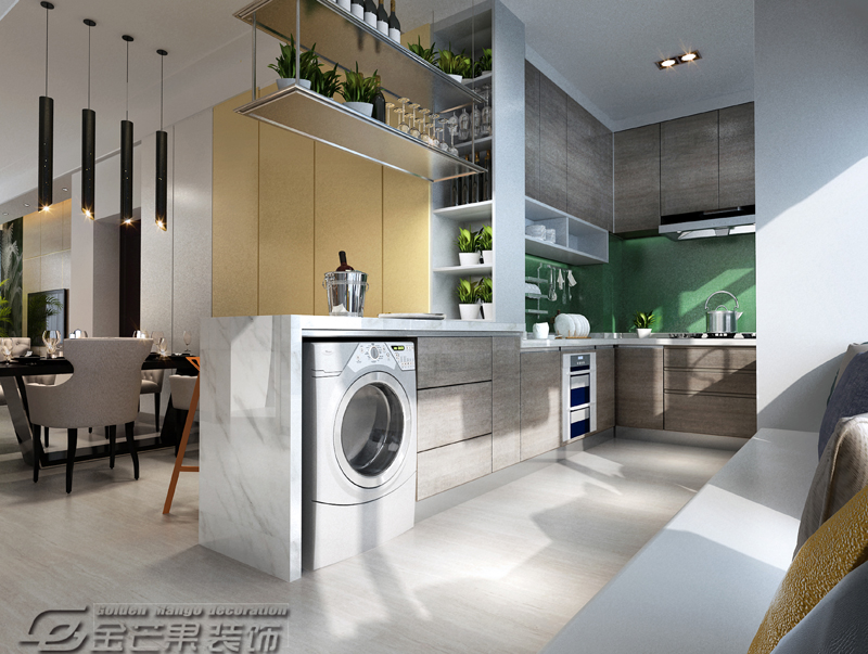 ▲ 廚房設(shè)計(jì),設(shè)計(jì)師打通了原廚房布局,和生活陽(yáng)臺(tái)打通,設(shè)計(jì)的開放式廚房,有情調(diào)的吧臺(tái)把廚房餐廳相融合,使整個(gè)空間開闊,明亮。