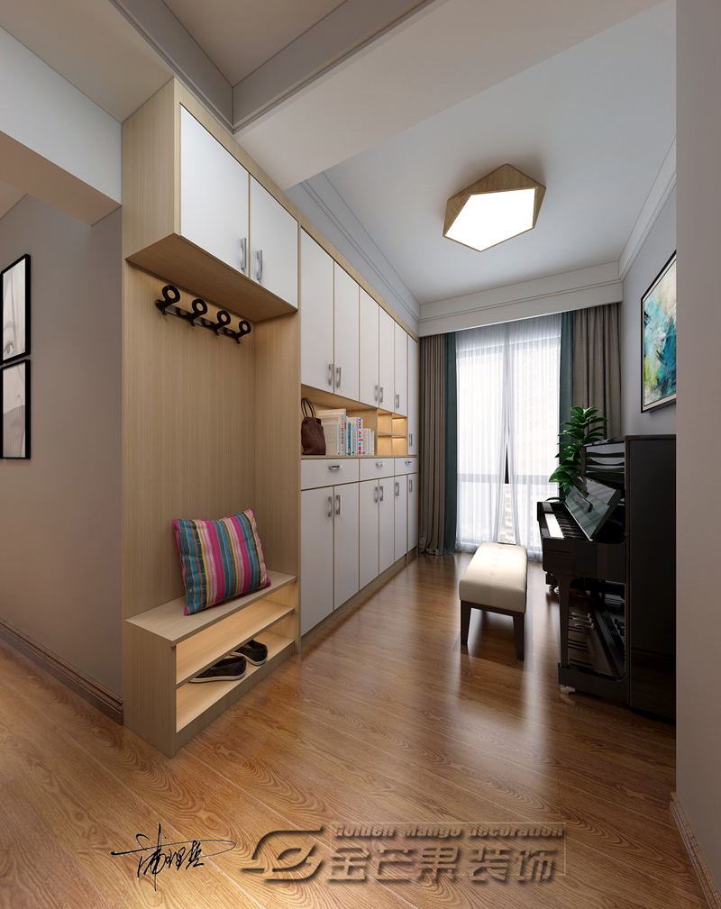 進(jìn)門玄關(guān)鞋柜處,擺放一臺(tái)鋼琴,方便小朋友休息的時(shí)候談練鋼琴,同時(shí)一家人都能欣賞到音樂(lè)。
