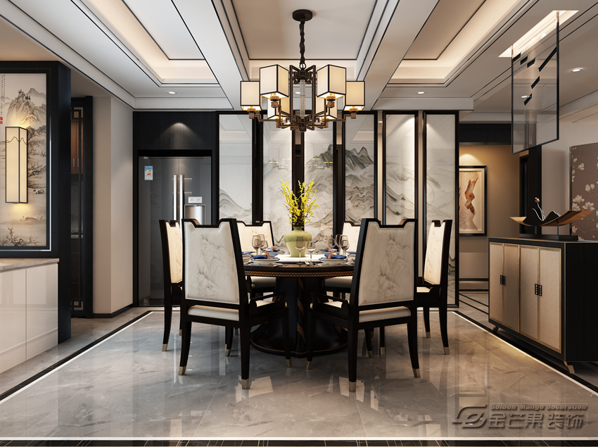 餐廳在設計上利用斗柜將客餐廳區域區分開來,背景的設計將水墨畫作為主體,后面的燈光設置讓空間的想象得以延伸,找尋的是江南水鄉里枕河人家的低吟淺唱。