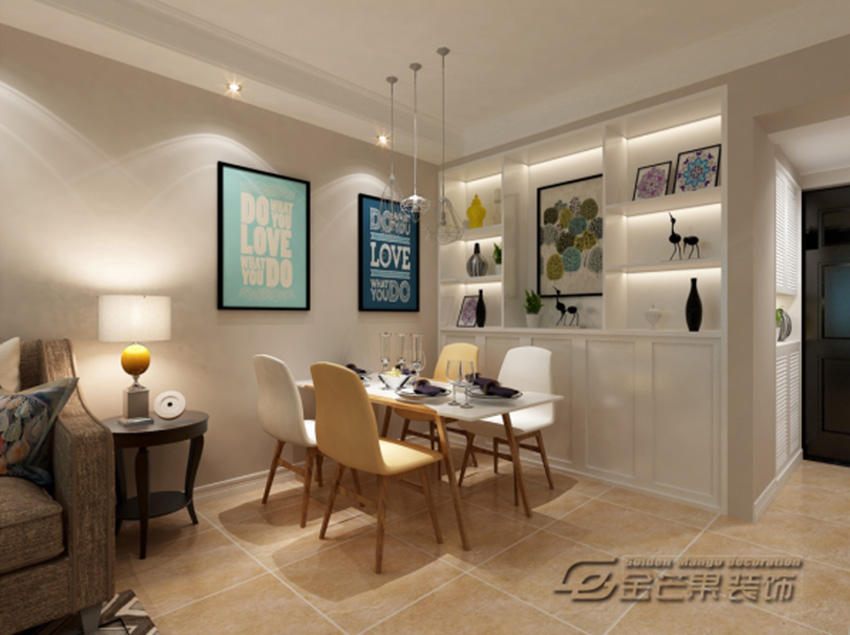 餐廳比較小,擺放了一張私人方形原木餐桌,配上掛畫,清新自然。