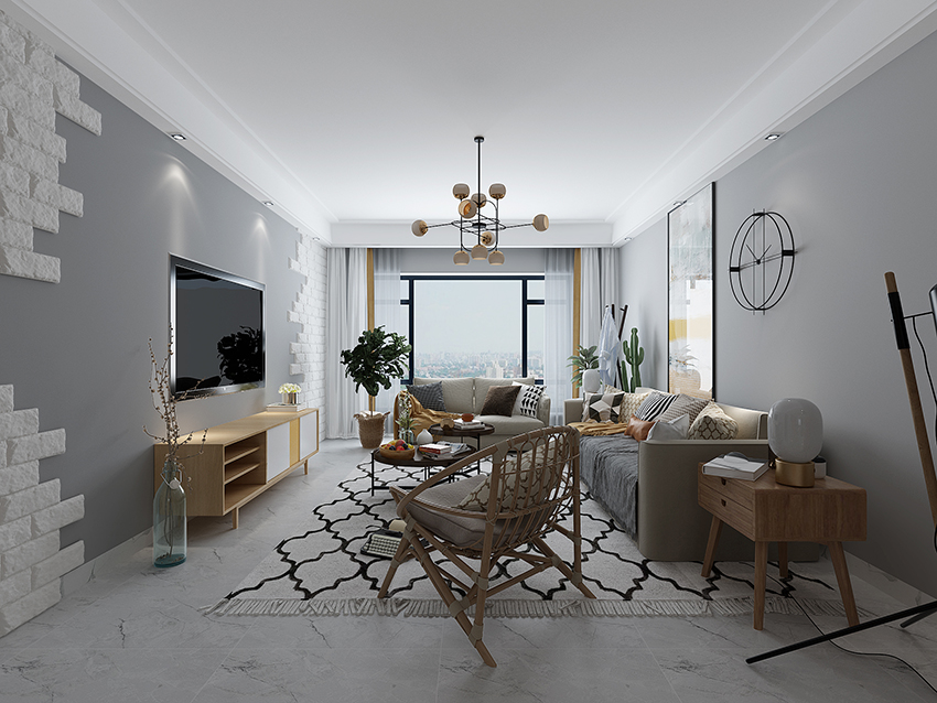 在客廳的設計中尤其突出設計的用心,客廳以灰色為背景,頂色依舊為經典的白色,百色磚貼在兩邊錯落有致,立體吊燈和鑲在墻內的電視更是增強了客廳的空間效果。窗簾則選用三層,為了搭配整體效果最外層選用白色,中間的一層則是主要的遮光作用,干凈利落體現無疑。