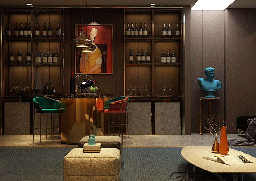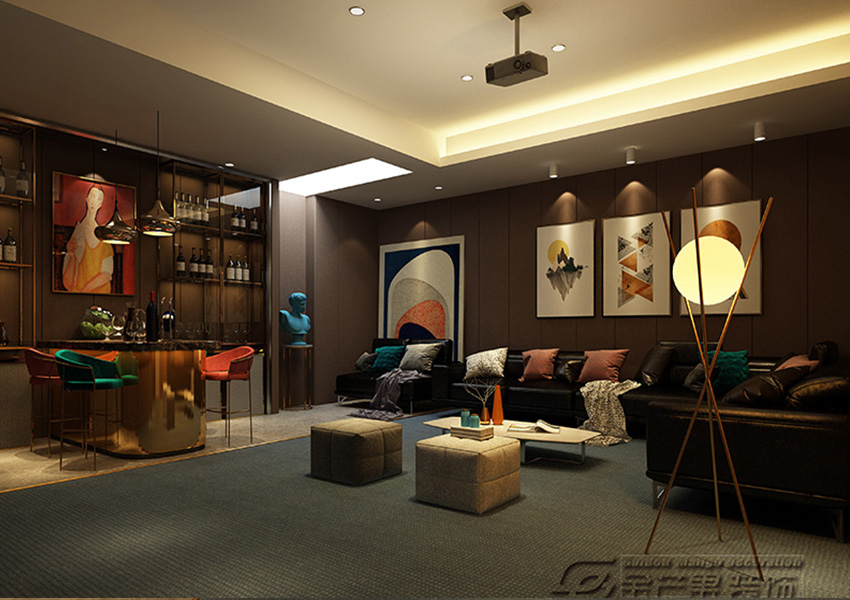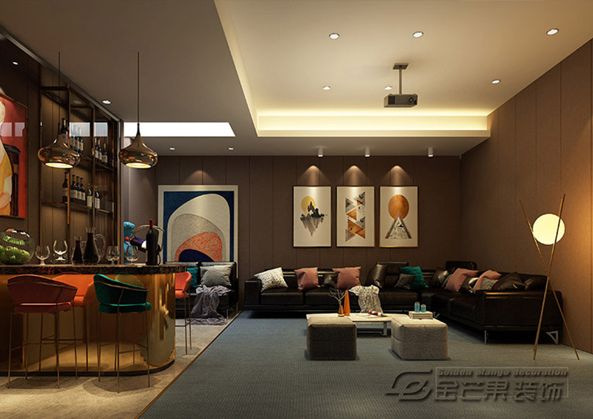 打造頂級的影院級,專屬空間。休閑沙發(fā),是長時間觀影的一大保障。酒柜里的紅酒也是情到深處的催化劑。抽象色彩的壁畫、雕塑也是對精神生活追求的表現(xiàn)。