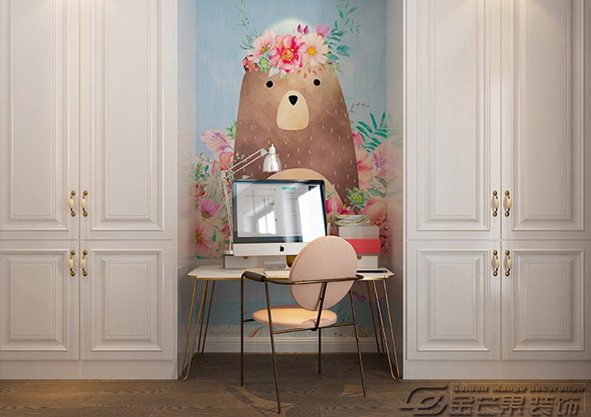 溫馨滿滿的女兒房,暖暖的粉色和可愛的壁畫,加以金屬桌椅。充滿著濃濃的少女心。白色的鋼琴,感受著來自音符的熏陶。公主所住的房間也就這樣了。