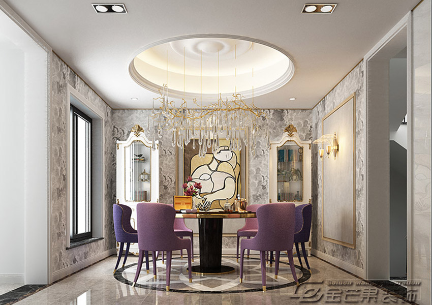 玲瓏剔透的水晶吊燈映入眼簾,紫色的凳子點(diǎn)綴著餐廳。地板圓形圖案、圓形餐桌、圓形的吊頂,更能彰顯團(tuán)團(tuán)圓圓之意,相互呼應(yīng)。壁畫也讓人充滿無限的想象。壁紙則是多了些許的內(nèi)斂。